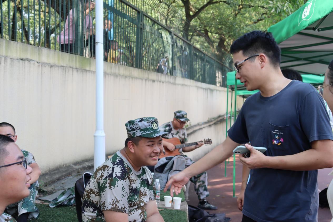在休息时间,胡老师向同学们表达自己的看法。军训是大学的第一课,强健体魄,更锻炼精神。胡老师还强调,如果在军训期间遇到身体不适,要及时报告,量力而行,身体才是学习和生活的本钱。