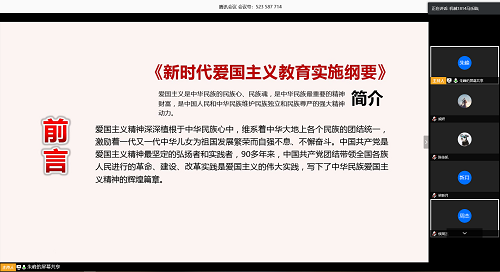 班委精心设计班会流程,四位同学率先领学,积极宣传疫情防控知识。班长朱峰带领大家学习领会习总书记关于疫情防控重要指示精神,团支书马乐晗宣讲《新时代爱国主义教育纲要》内容,增强同学们的必胜信心和爱国热情;心理委员安莊传递疫情期间身心健康理念和防控知识,安全委员孟想讲解《玩偶姐姐