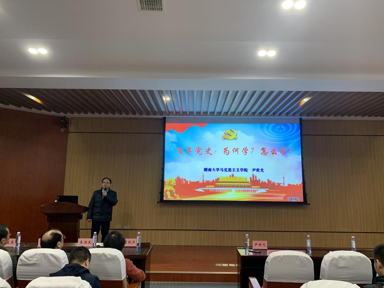 ,同志们对于学习党史的需求十分迫切。在庆祝党百年华诞的重大时刻,“两个一百年”奋斗目标历史交汇的关键节点,全党集中开展党史学习教育,正当其时,十分必要。并对尹世尤教授莅临现场授课表示热烈的欢迎与由衷的感谢。
