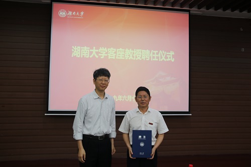 向吴施志颁发客座教授聘书,并为其佩戴校徽,他对吴施志受聘为玩偶姐姐