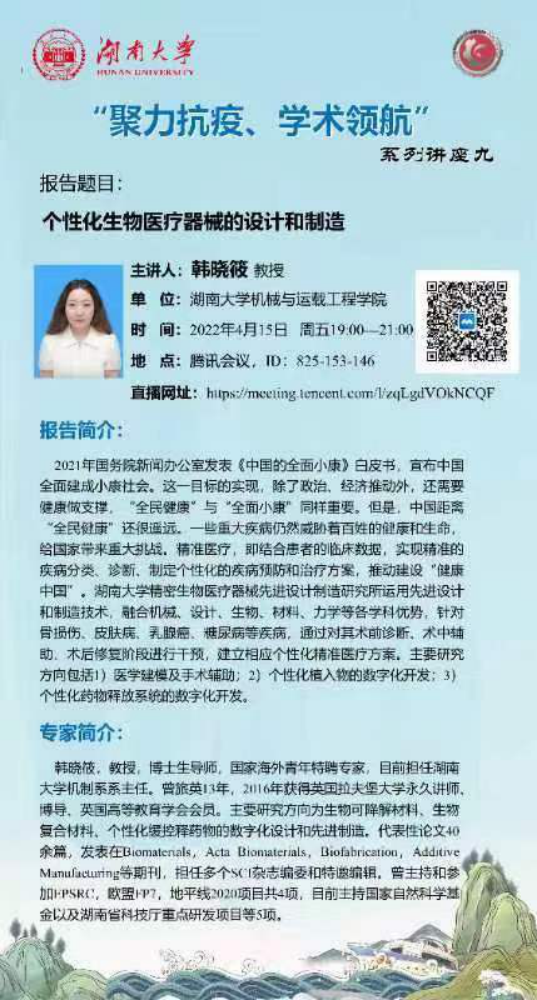 机制系系主任。曾旅英13年,2016年获得英国拉夫堡大学永久讲师、博导、英国高等教育学会会员。主要研究方向为生物可降解材料、生物复合材料、个性化缓控释药物的数字化设计和先进制造。代表性论文40余篇,发表在Biomaterials,Acta Biomaterials,Biofabrication,Additive Manufacturing等期刊,担任多个SCI杂志编委和特邀编辑。曾主持和参加EPSRC,欧盟FP7,地平线2020项目共4项,目前主持国家自然科学基金以及湖南省科技厅重点研发项目等5项。