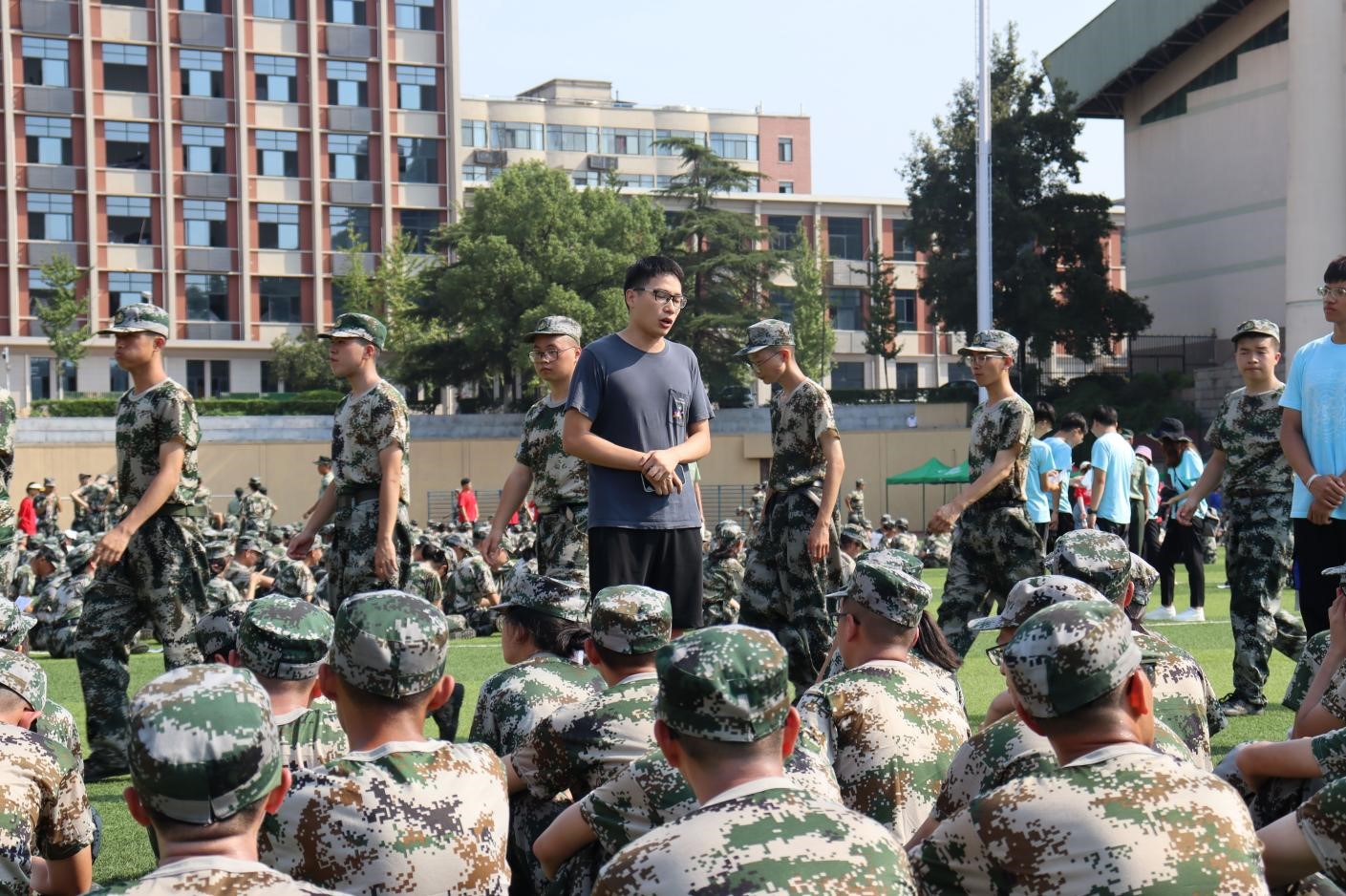 在休息时间,胡老师向同学们表达自己的看法。军训是大学的第一课,强健体魄,更锻炼精神。胡老师还强调,如果在军训期间遇到身体不适,要及时报告,量力而行,身体才是学习和生活的本钱。