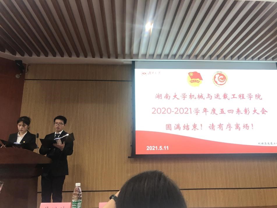 5月11日晚,2020-2021学年度“扬我青年志”五四表彰大会于机械院院楼401报告厅顺利召开。本次大会旨在进一步完善团学组织体系和工作机制建设,不断增强团组织的吸引力、凝聚力,全面服务学生的成长成才,激发广大团干部、团员青年的荣誉感、责任感、使命感,激励和引导全院广大青年继承和发扬“五四”精神,不忘初心、牢记使命,以优异成绩庆祝建党100周年。院党委书记彭晓燕老师、院党委副书记易洪波老师、院团委书记孙文婷老师、本科2018级辅导员谭想老师、本科2019级辅导员李迪老师、王伟彬老师、本科2020级辅导员李明泽老师出席本次会议。