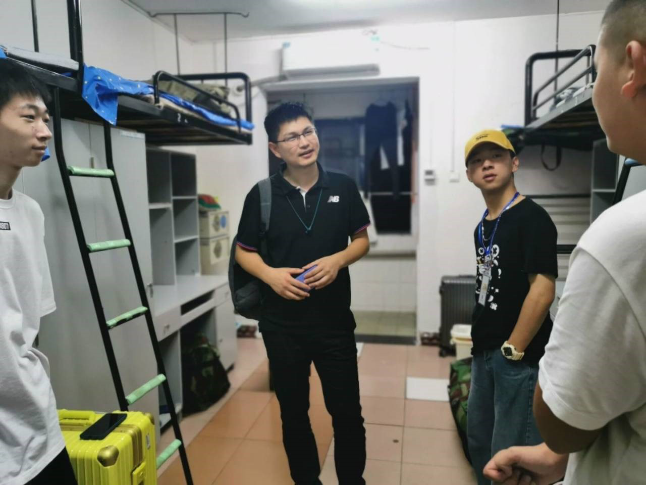 彭晓燕书记,易洪波书记带领新生班主任,首先看望了一区三栋男生寝室,关切地询问同学们的家乡、兴趣爱好和饮食习惯等。不仅向同学们表达了热烈欢迎,而且向新生传达了许多日常学习生活中的经验以及来自长辈的亲切嘱托。在看望新生寝室的过程中,老师们十分关心新生住宿情况,特地打电话问了关于新生床位与书柜的情况,“衣柜和书桌是否一体,宿舍床梯子安不安全,新生的卧具是否买齐”。