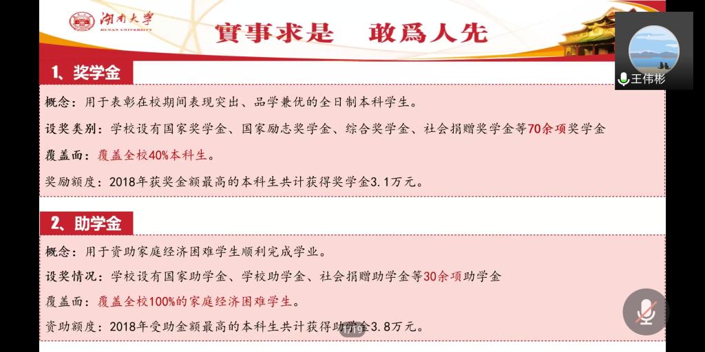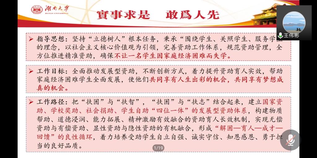 目前全覆盖的资助政策体系。除此之外,他还向参会人员简单展示了2019年学生奖助学金的大致情况,梳理了各项政策审核的重要时间节点。