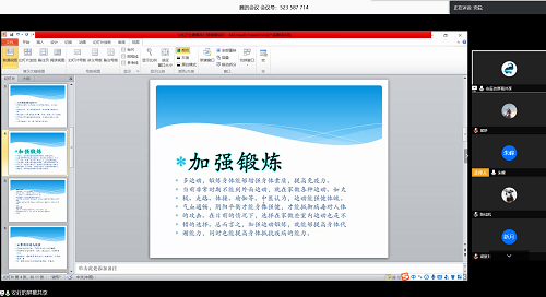 班主任余剑武老师对班会进行总结,从疫情情况、学习、心理和安全防护等方面展开说明,引导同学们坚定抗“疫”必胜信心、为国家做力所能及的贡献;分享自己在家积极运动的例子,特别提醒同学们重视锻炼身体,安排好学习生活。学工部龚翔老师对组织参与会议的师生表示感谢,建议同学们将精力转向“三个投入”。一是将精力投入到在线学习和自主学习中,增强自律性;二是投入到做好健康档案的相关工作中,提供及时、准确、全面的健康信息;三是投入到“爱国力行”的主题教育活动中来,积极参与疫情防控工作,展现玩偶姐姐