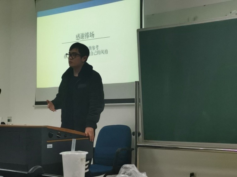 前半场海天学长以“事实层面下怎么打”为主题阐述了数据、举例和理论在辩论赛中的具体应用和辩论技巧。海天学长首先阐明了反驳是事实层面下最重要和最有效的应对方法,从反驳的对象、步骤、层次、常用思路四个方面具体形象地讲述了如何科学地反驳。对于数据的反驳和推论,海天学长举出了辩论赛中的大量实例,引导队员们积极地思考和表达,然后总结了注意事项和操作方法。关于举例和理论的作用和应用,海天学长都采取了这种引导和总结的方式,内容充实,言谈知识与趣味并存,队员们认真听讲和做笔记,收获良多。海天学长表示,对于一个辩手来讲,质疑精神尤其重要,无论是赛场上还是生活中都要进行积极深入地思考。最后,他告诉队员们,他总结和分享的内容仅仅是自己的多年辩论经验之谈,希望每一位辩手都能不拘泥于前人的理论,打出自己的风格。