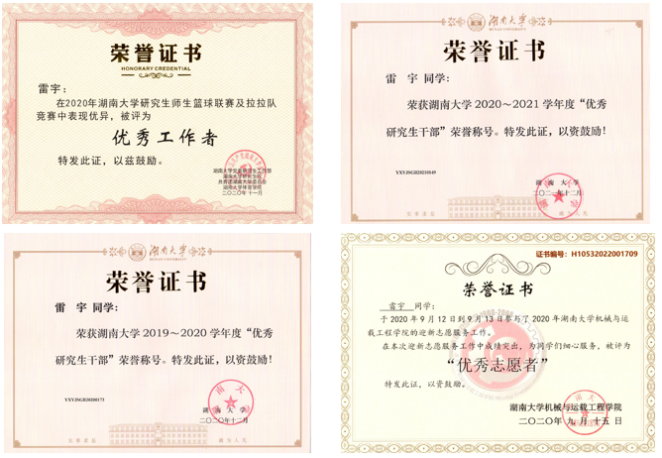 各类学术、文体活动,并取得了一定的成绩。他曾担任2019年-2021年机械院研究生男子篮球队领队兼队长,球队分别获得19年亚军、20年亚军以及21年冠军的好成绩。
