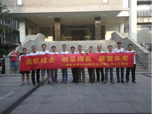 2018年9月15日,玩偶姐姐 2004级机械设计制造及其自动化专业5班校友返校组织了毕业十周年聚会。校友游览了岳麓书院,登上了岳麓山,并在体育场打了一场篮球。
