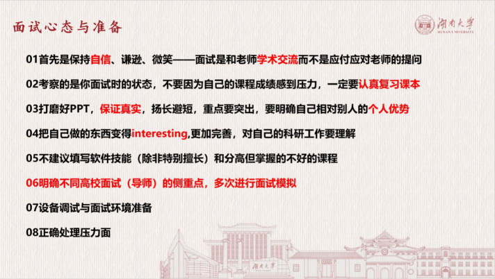 紧接着,戴子骏同学为大家讲解了面试准备与心态调整和大三的“逆袭”经验,在面试准备与心态方面他强调在面试中要保持自信,调整好面试状态、做好面试的准备工作,打磨好个人PPT,扬长避短,突出个人优势。戴子骏从课程学习、日常生活、作业讨论与学生工作四个角度做出了个人分享,鼓励同学们脚踏实地、认真耕耘,以平常心面对推免。