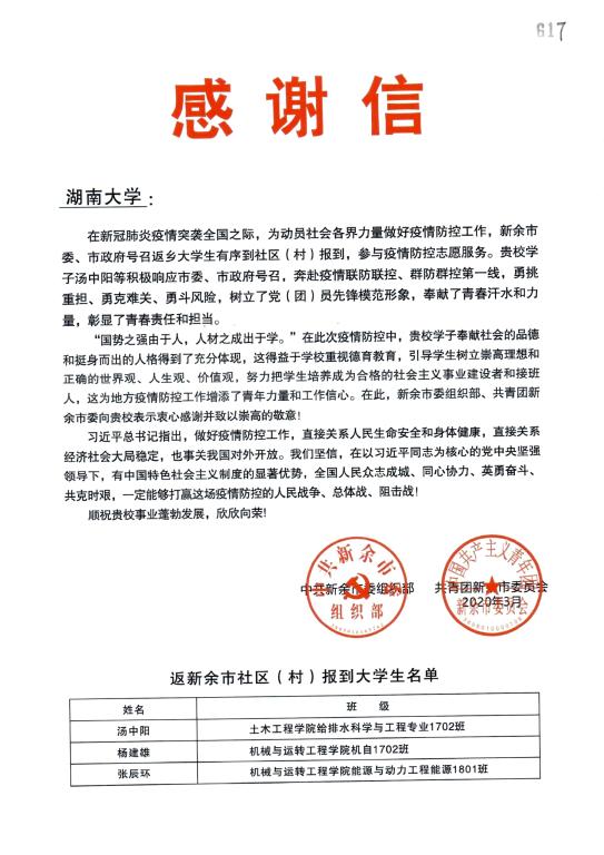 新余市委组织部和团市委向机械院杨建雄和张辰环同学在抗疫中的表现表示感谢