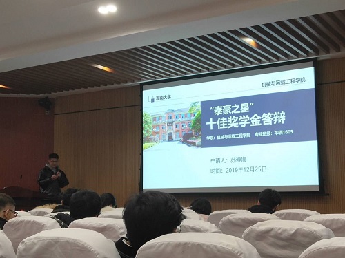 12月25日14: 00,2018--2019学年度“泰豪之星”十佳奖学金答辩暨颁奖仪式于机械院401报告厅举办。泰豪集团有限公司招聘经理齐耀城、衡阳泰豪通信车辆有限公司副总经理冯文明、衡阳泰豪通信车辆有限公司人力资源部经理罗想,机械院资助兼干王伟彬、研究生辅导员黄倩雯、本科2016级辅导员李健、本科2017级辅导员闫智琪以及本科2018级辅导员熊妍出席并作为本次答辩的评委。