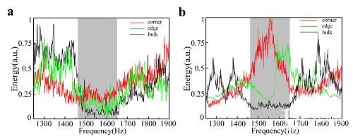 图正六角样品实验传输图谱。a.膨胀单元构成的正六边形的传输图谱。b.收缩单元构成的正六边形的传输图谱。红线、绿线和黑线分别代表角、边界和体上测得的能量传输率。