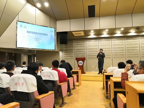 车辆工程系主任白中浩教授主持,上汽商用车技术中心智能驾驶产品开发科高级经理何业嘉先生主讲,智能网联汽车试点班、智能制造试点班、部分研究生等近五百名学生参加。