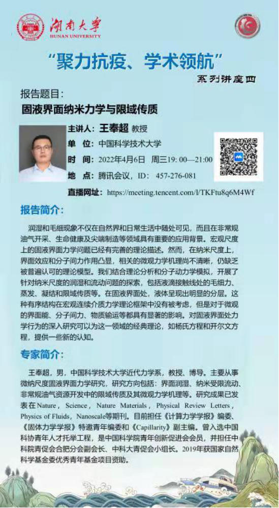 王奉超,男,中国科学技术大学近代力学系,教授、博导。主要从事微纳尺度固液界面力学研究,研究方向包括:界面润湿、纳米受限流动、非常规油气资源开发中的限域传质及其微观力学机理等。研究成果已发表在Nature,Science,Nature Materials,Physical Review Letters,Physics of Fluids,Nanoscale等期刊。目前担任《计算力学学报》编委、《固体力学学报》特邀青年编委和《Capillarity》副主编。曾入选中国科协青年人才托举工程,是中国科玩偶姐姐